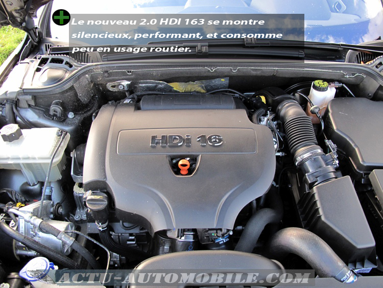 Le nouveau 2.0 L HDi FAP  est un bloc en fonte qui développe une puissance de 120 kW soit 163 ch à 3 750 tr/min. Avec cette respectable puissance et son couple maximal de 340 Nm (constant entre 2 000 et 3 000 tr/min), ce quatre cylindres arrive à faire oublier sans mal l’ancienne mouture de 136 Ch. A l’instar du 2.2 hdi 170 qui vient de tirer sa révérence, ce moteur ne dispose que d’un seul turbo à géométrie variable.