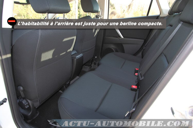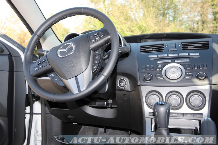 L’équipement reste très complet pour une finition située en milieu de gamme. Au niveau fonctionnalité, la 3 concentre tout sur son volant. En effet, pour commander l’autoradio, le GPS, l’ordinateur de bord, et le régulateur de vitesse, il faut jouer des molettes et autres boutons, ce qui s’avère plutôt pratique. En revanche, nous avons remarqué que le flux d’air de la climatisation se faisait ressentir qu’après plusieurs tours de roues.