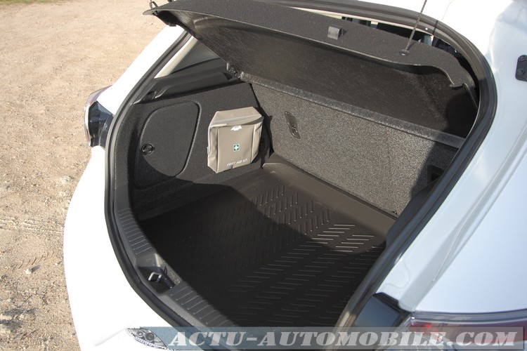 La japonaise se rattrape avec son coffre, qui reste très généreux avec ses 340 litres. Très carré, il possède une hauteur de 0,808 mètre, ce qui permet le chargement de plusieurs bagages. La banquette arrière est rabattable en 1/3 2/3. On remarque un bouton sur le feu arrière droit, qui permet la fermeture complète de la voiture par simple impulsion. Ceci ne vaut pas le système main libre Renault, à savoir le verrouillage automatique en s’éloignant du véhicule, mais ce système est tout de même appréciable si l’on a les bras chargés.