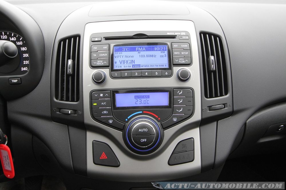 L’habitacle de cette i30 est très plaisant à vivre. L’ensemble reste sobre et bien présenté. La qualité des matériaux est bonne tout comme les assemblages. Cela devrait faire oublier à certains quelques préjugés sur les intérieurs des coréennes ! La planche de bord adopte un éclairage bleu pour les afficheurs. Au centre des compteurs nous retrouvons deux afficheurs LCD qui offrent une bonne visibilité au conducteur. La température moteur, la consommation, un indicateur de changement de rapports et les autres informations du véhicule sont ainsi indiqués.
