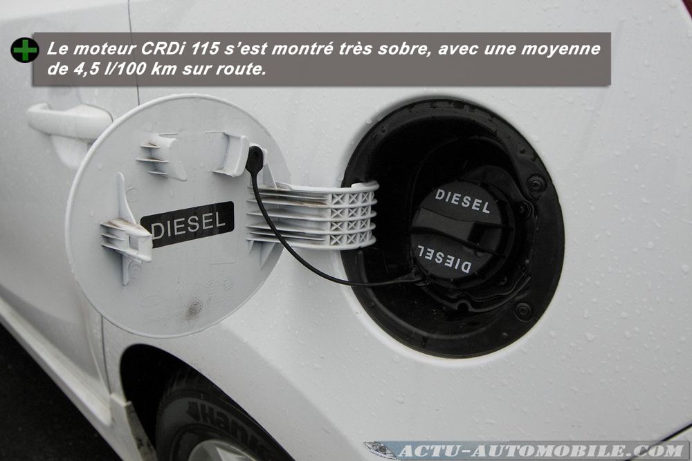 Le moteur CRDi 115 s’est montré extrêmement sobre durant notre essai. Sur route nous avons réalisé une moyenne de 4,5 l/100 km ! En ville nous n’avons pas dépassé la barre des 6,5 l/100 km. De plus, 500 € de bonus écologique vous seront accordés lors de l’achat (100 € en 2011).