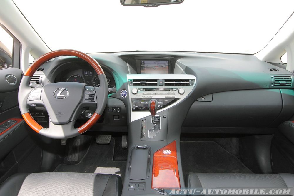Sobre et harmonieux, l’habitacle du RX 450h nous rappelle tout de suite que nous sommes à bord d’une Lexus. Même si certains plastiques dénotent encore, l’ensemble est plutôt bien fini.