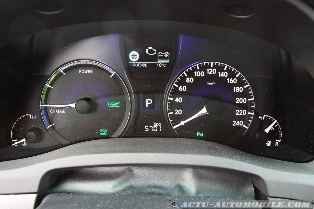 A la place d’un compte-tours classique, le RX 450h dispose d’un compteur qui vous informe sur le fonctionnement du système hybride. Il est partagé en trois zones, bleue lorsque la batterie se recharge, verte pendant une conduite « éco », et  blanche lors des phases d’accélérations importantes. De plus un schéma entre les compteurs vous indique en temps réel le fonctionnement.